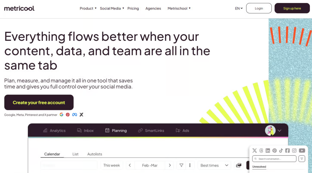 I found Metricool to be clean, modern, and beginner-friendly. You can create reports, visualize performance, and monitor audience conversations from the same dashboard you use to schedule content.